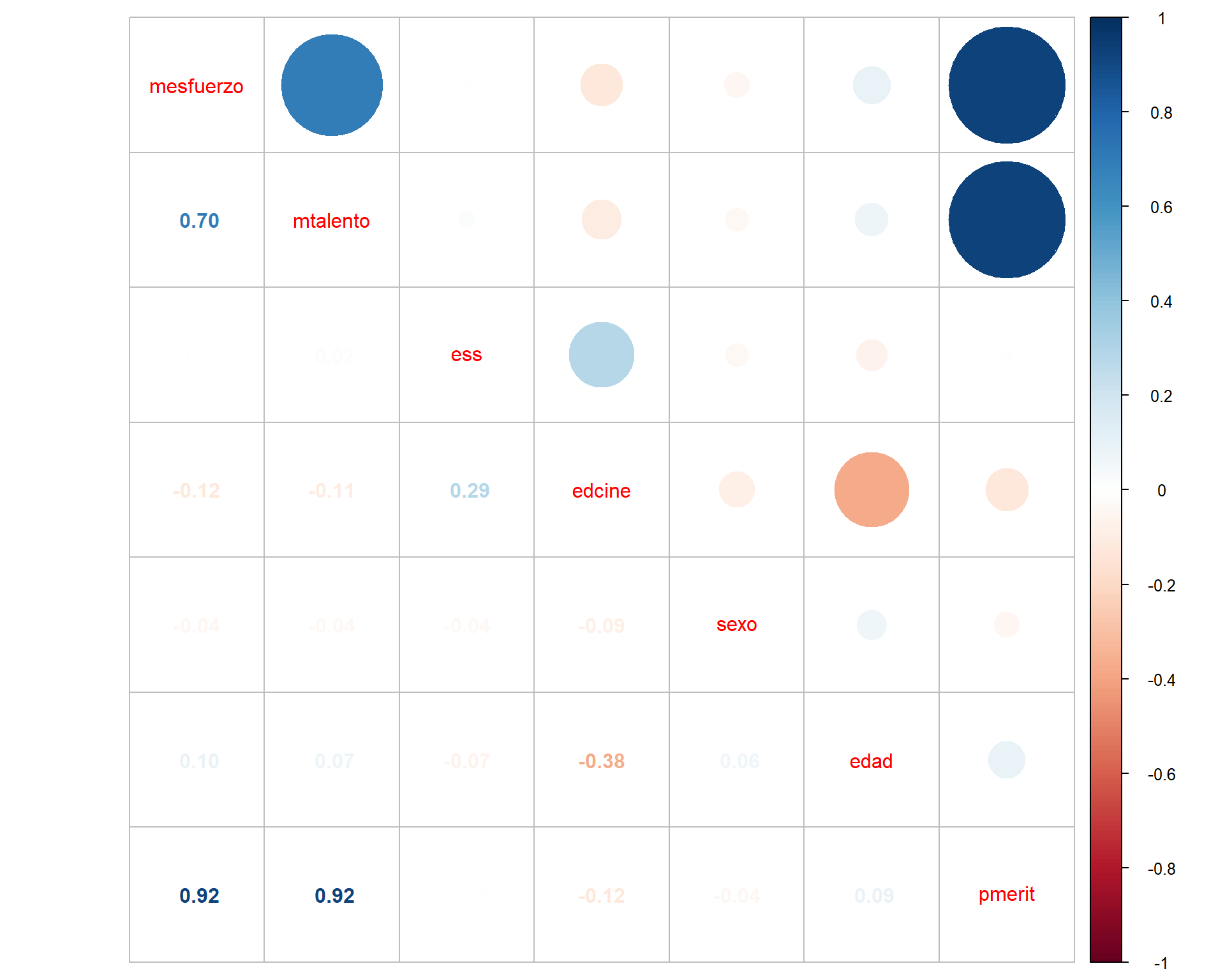 mesfuerzoymtalentoes 0.69. - La información de cada coeficiente se repite sobre y bajo la diagonal, ya que es el mismo par de variables pero en el orden alterno. Por convención en general se omiten las correlaciones redundantes sobre la diagonal, por eso aparece en blanco.