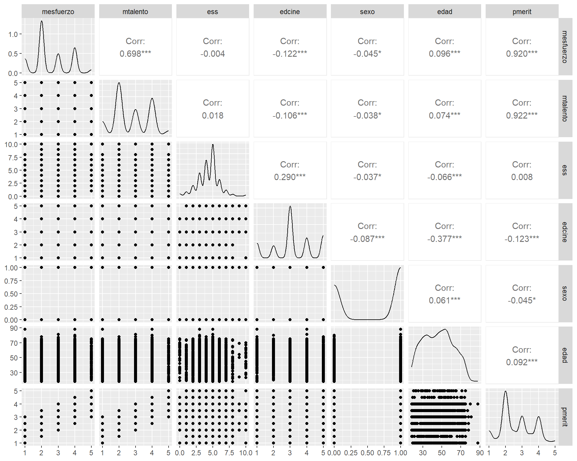 triangle = "lower")| Recompensa: esfuerzo | Recompensa: talento | Estatus Social Subjetivo | Educación | Sexo | Edad | Meritocracia promedio | |