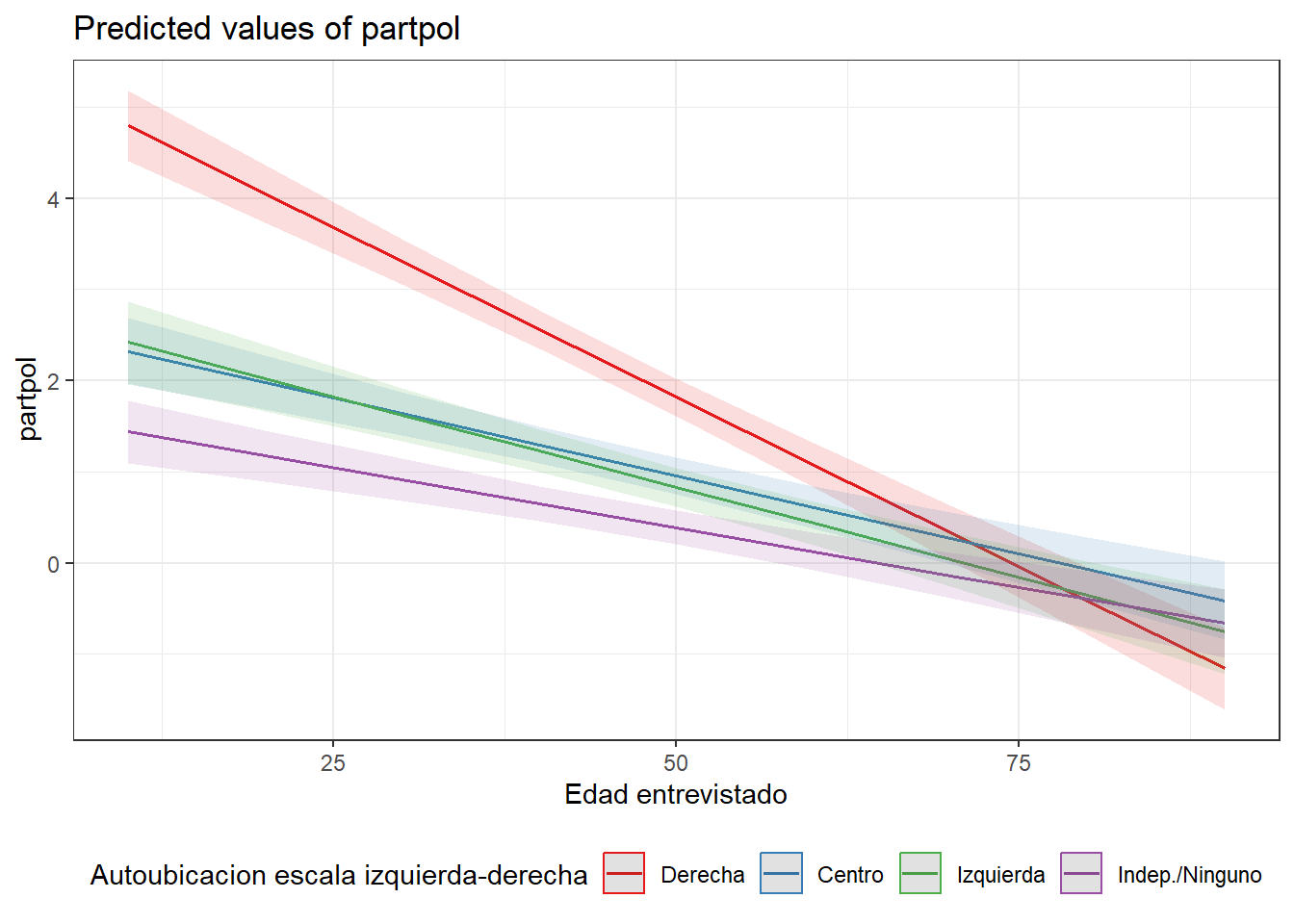 En comparación con las personas de Derecha, el efecto negativo de la edad no es tan pronunciado en personas de Centro, Izquierda o independientes.