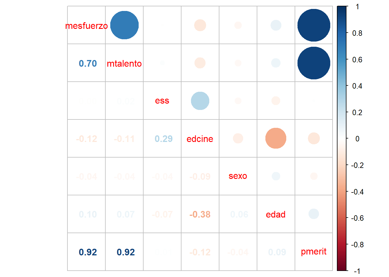mesfuerzoymtalentoes 0.69. - La información de cada coeficiente se repite sobre y bajo la diagonal, ya que es el mismo par de variables pero en el orden alterno. Por convención en general se omiten las correlaciones redundantes sobre la diagonal, por eso aparece en blanco.