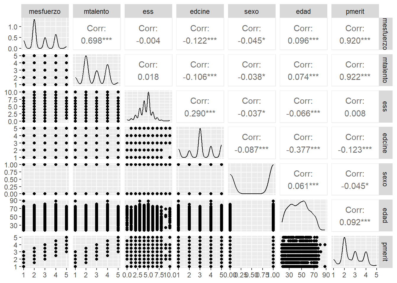 triangle = "lower")| Recompensa: esfuerzo | Recompensa: talento | Estatus Social Subjetivo | Educación | Sexo | Edad | Meritocracia promedio | |