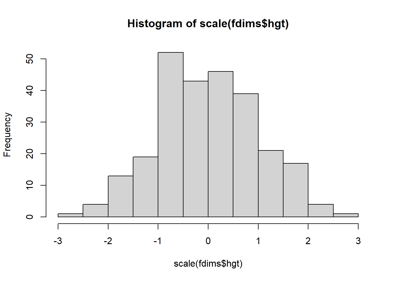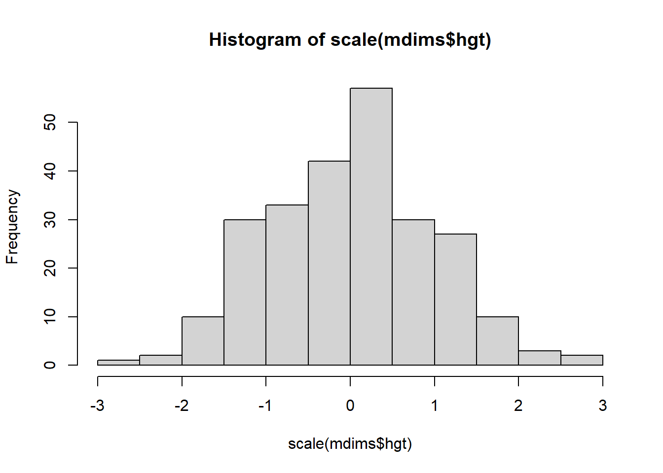 scale es una función en R y se puede aplicar a cualquier vector numérico (lista de números en R). Genere los dos histogramas siguientes, esta vez graficando scale() de las estaturas y determine cómo la versión escalada de las alturas corresponde a las alturas originales. ¿Qué calcula la escala para cada punto?