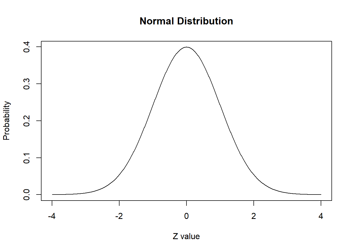 x.values <-seq(10,30, length =1000)y.values <-dnorm(x.values, mean =20, sd =1.65) # indico media y sdplot(x.values, y.values, type="l", lty=1, xlab="Z value", ylab="Probability", main="Normal Distribution")